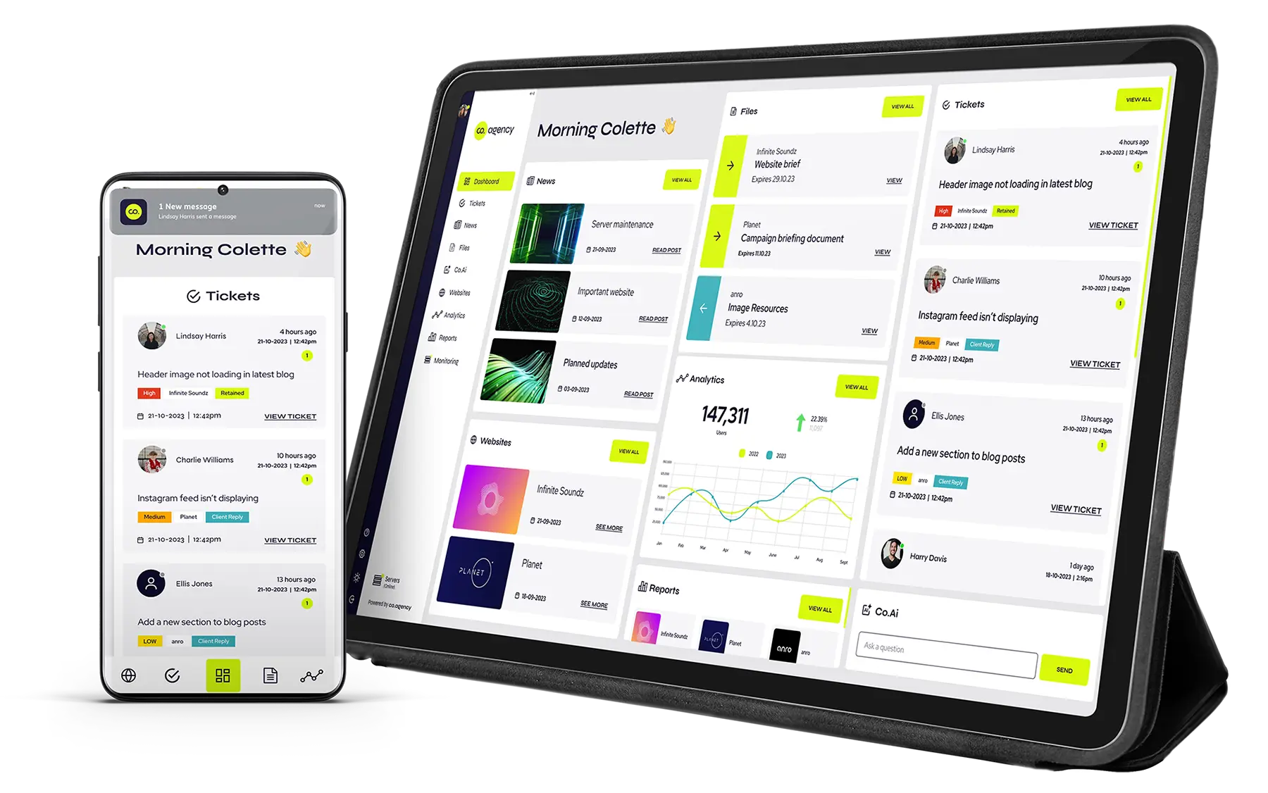 Be in the know with real-time data on how your team uses co.agency including average ticket response time, user numbers and more.
